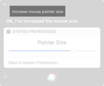 A Siri-t elindíthatja a menüsáv (vagy érintősáv) jobb felső sarkából is, vagy lenyomva tarthatjaCmd (⌘)+Szóköz. Most kérdezze meg Sirit: "Növelje az egérmutató méretét."
