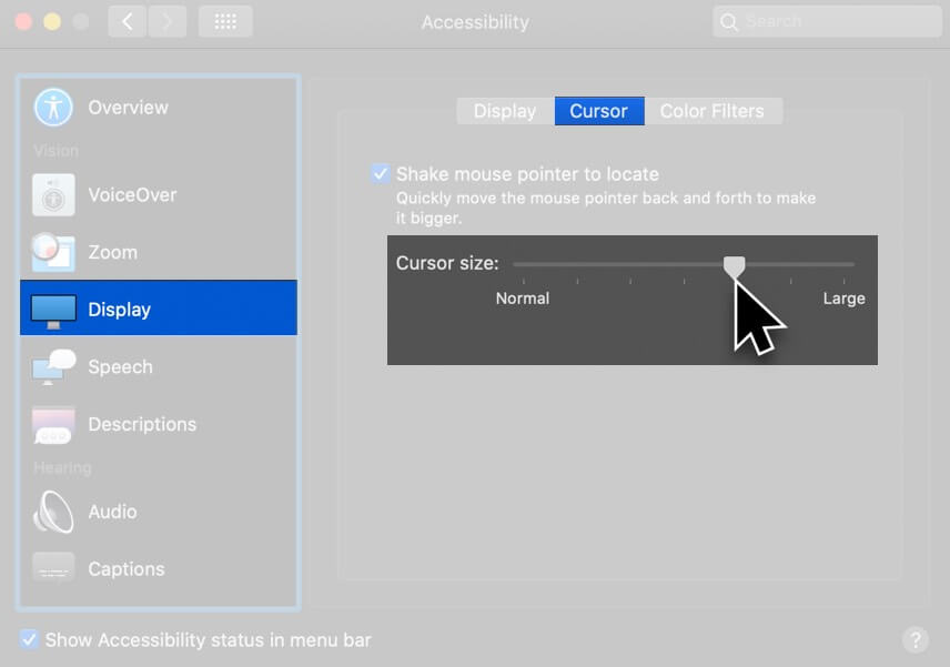 A macOS lehetővé teszi az egérmutató méretének tetszés szerinti beállítását. A kurzor méretének növeléséhez indítsa elRendszerbeállítások→Megközelíthetőség→Kijelzőa bal oldalsávról →Kurzor→ húzza a lehetőségetKurzor méretcsúszkát.