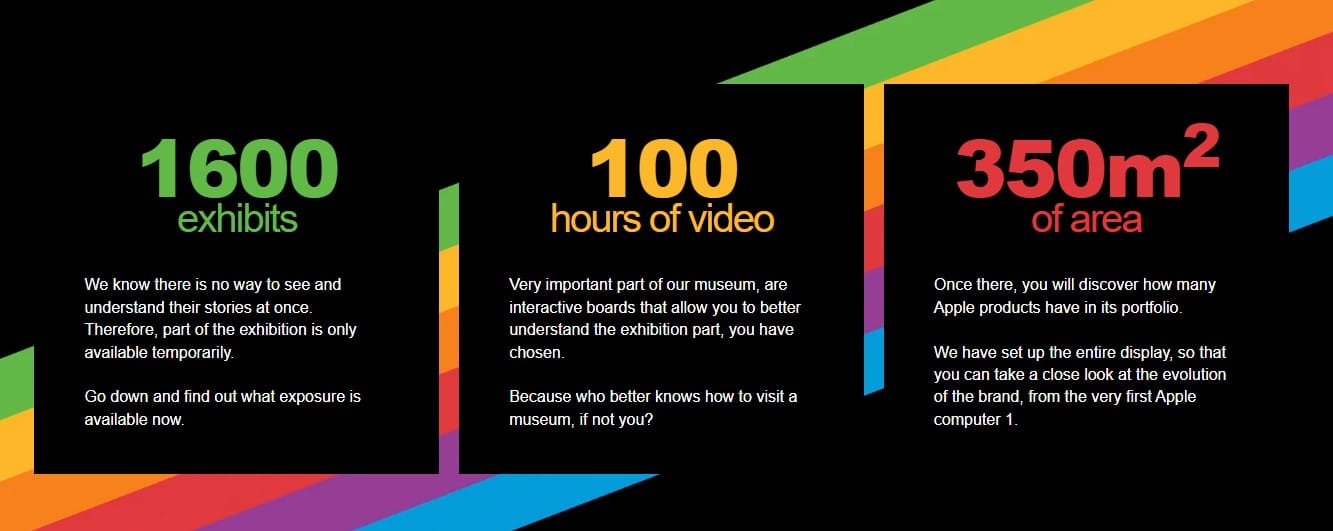 Az Apple termékek fejlesztésével és evolúciójával kapcsolatos több mint 16 000 kiállítással a termékeket rendszeresen forgatják. A múzeum bemutatja a „A világ legteljesebb és a legnagyobb gyűjteményét”, amely számítógépeket, laptopokat, kiegészítőket, telefonokat, szoftvereket, perifériákat, multimédiás hordozókat, egyedi Apple anyagokkal, plakátokkal és még sok mással mutat be.