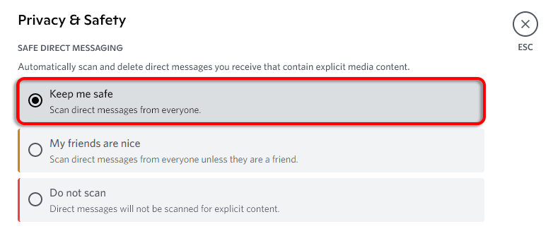 - Válassza kiTarts meg biztonságbana „Biztonságos közvetlen üzenetküldés” alatt.