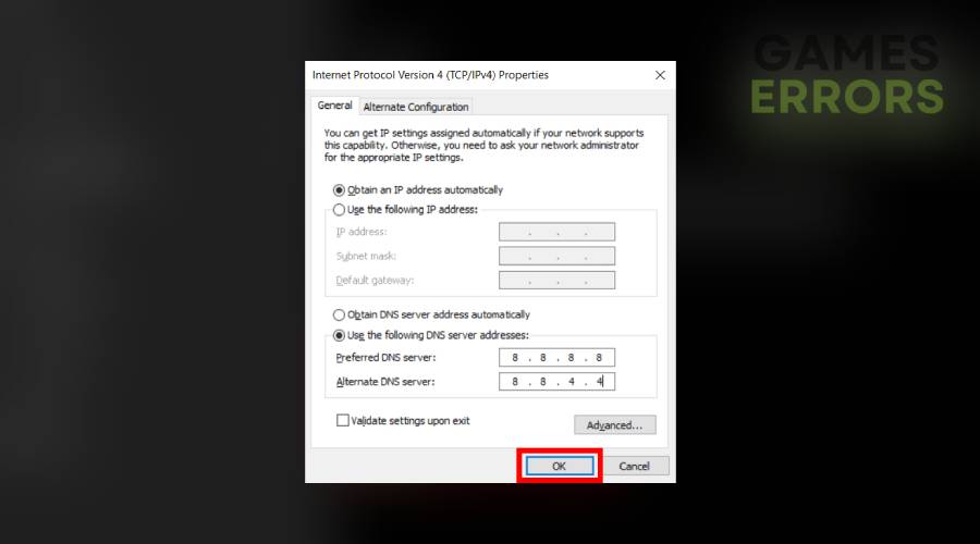 - Végül használjaA Google 8.8.8.8mint az elsődleges DNS -kiszolgáló és8.8.4.4mint alternatív DNS -kiszolgáló.