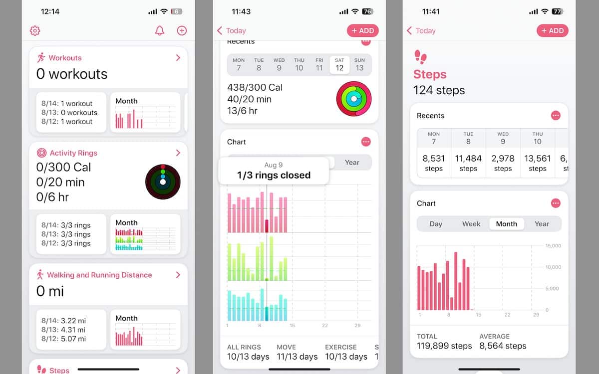 Itt található a mindkét fitnesz -nyomkövető alkalmazás felhasználói felületének, metrikájának és kezdőképernyő kütyüinek vizuális összehasonlítása.