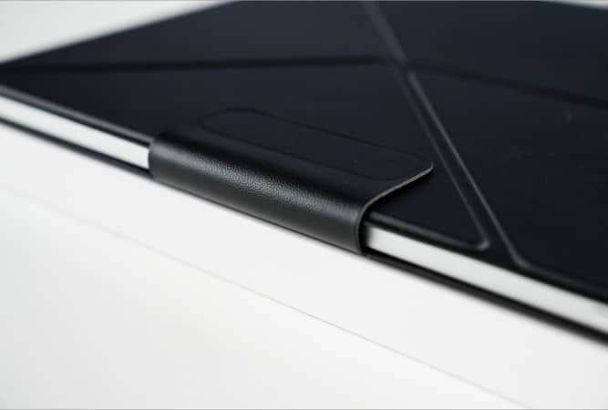 Ezenkívül a terméknek egy apró rejtett mágneses hevedere van az oldalán. Szilárd markolattal a kis heveder az almás ceruzát a tabletta közelében rögzíti. Ha nem akarja, hogy a heveder kiszabaduljon, akkor befelé fordulhat, hogy mágnesekkel beragadjon a fólióba.