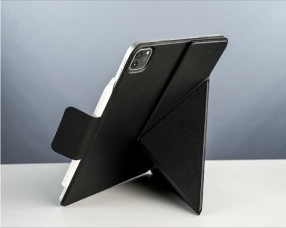 A fólióburkolat megtervezéséhez használt anyag szuper könnyű és tapintású. Nem fogja érezni azt a szemcsés textúrát, amely általában bőr tokokkal jár. Ezenkívül a háromszög alakú, origami összecsukható tartó vízszintes és függőleges stabilitást biztosít az iPad Pro számára.