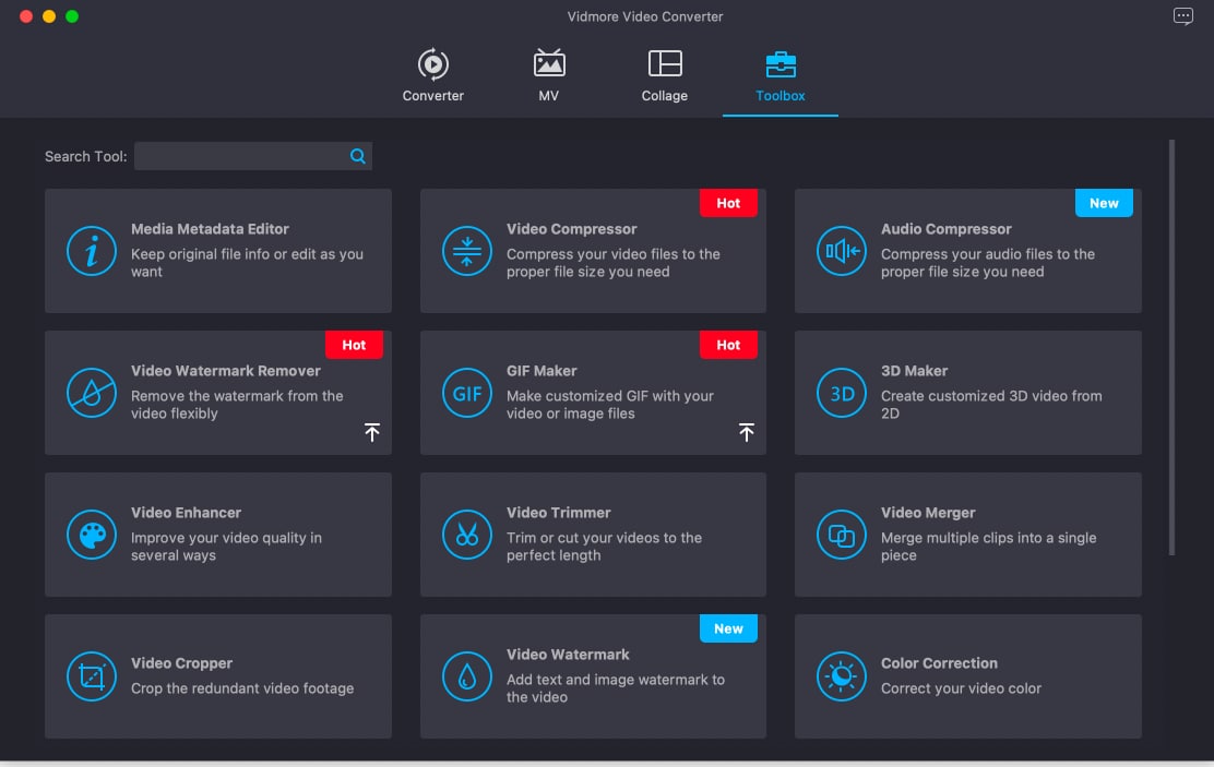 Az Eszköztár lap egy kincsesláda, amely tele van használható funkciókkalelőkelő videóvagy könnyedén készítsen remekművet. Mielőtt további részletekbe merülnénk, hadd soroljam fel a Vidmore Toolbox által kínált összes funkciót,
