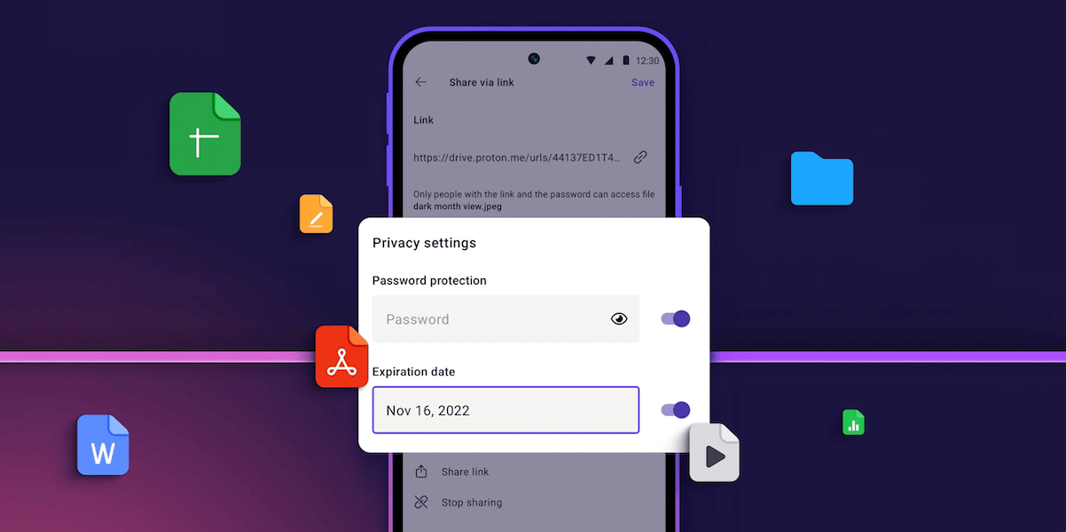 - Biztonságosan és biztonságosan ossza meg a fájlokat olyan címzettekkel is, akik nem rendelkeznek proton -fiókkal a jelszóvédelemmel, és összekapcsolják a lejárati dátumokat a hozzáadott biztonsági rétegekként.