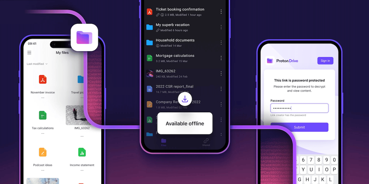 "Ha aktiválja az offline hozzáférést egy fájlhoz vagy mappához, akkor azok titkosítva és mentésre kerülnek a készüléken, hogy csak a Proton Drive alkalmazáson keresztül érhessék be őket. Ez állandó hozzáférést biztosít a fájlokhoz anélkül, hogy veszélyeztetné a biztonságukat."