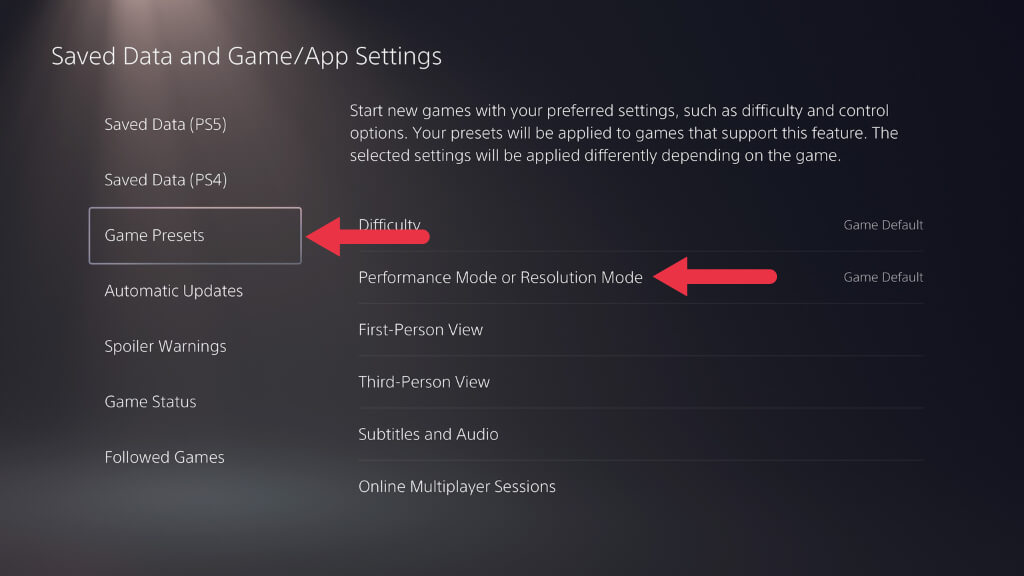 Jegyzet:Ez a beállítás csak azt mondja a PS5 -nek, amit általában inkább inkább; Ez nem akadályozza meg, hogy manuálisan váltson egy másik módra a játék menükben. Tehát játékonként felülbírálhatja ezt.