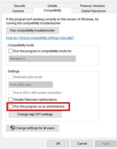- Törölje a jelölést a„Futtassa ezt a programot adminisztrátorként”Opció aKiváltsági szint.