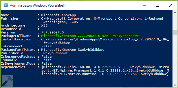 Ebben a példában az Xbox alkalmazás újraregisztrálásának folyamatát mutatjuk be. Ezért esetünkben a csomag neve azMicrosoft.XboxApp_7.7.29027.0_x86__8wekyb3d8bbwe.