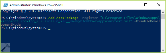 Add-AppxPackage -register "C:Program FilesWindowsAppsMicrosoft.XboxApp_7.7.29027.0_x86__8wekyb3d8bbweappxmanifest.xml" -DisableDevelopmentMode