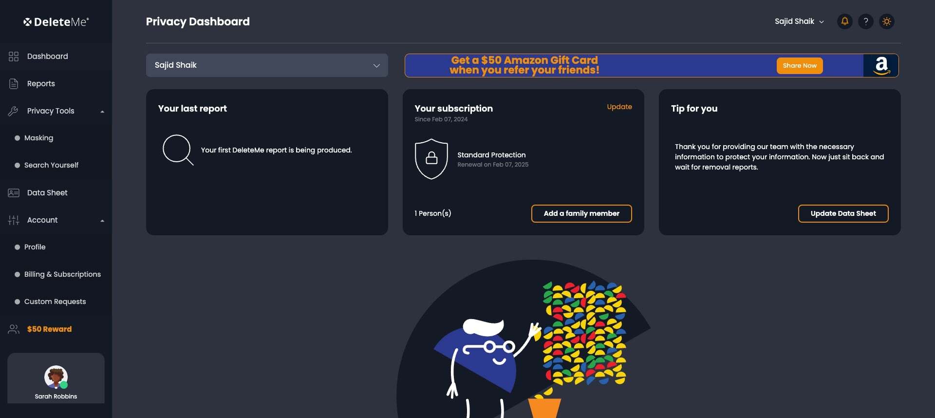 A DeleteMe személyre szabott adatvédelmi jelentéseket, eszközöket és még személyes adatvédelmi tanácsadót is biztosít, hogy segítsen megérteni és javítani az online adatvédelmet.