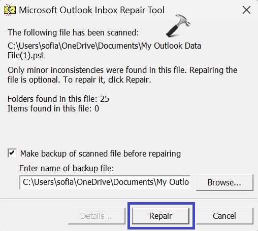 7. A PST-fájl kiválasztása után kattintson a „Javítás” gombot a javítási folyamat elindításához.