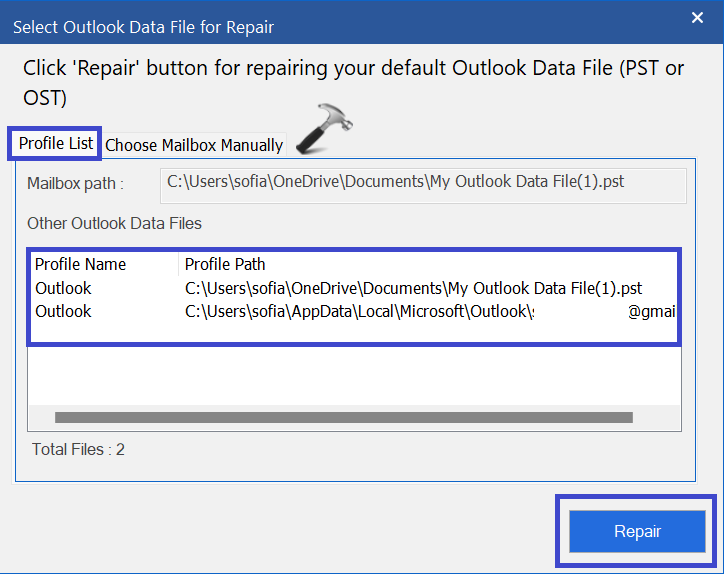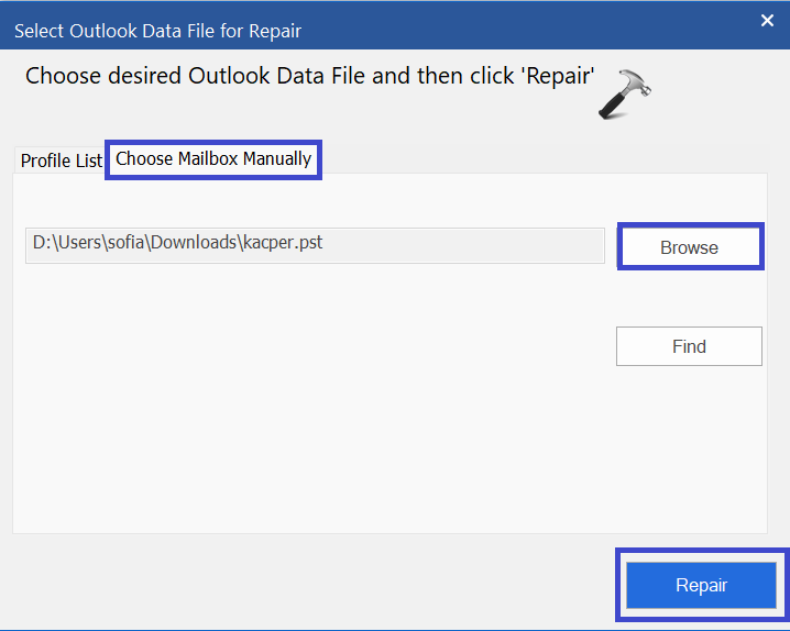 A „Válassza a Manuális lehetőséget” opció lehetővé teszi, hogy manuálisan böngésszen a számítógépén a javítani kívánt PST-fájl megkereséséhez és kiválasztásához.