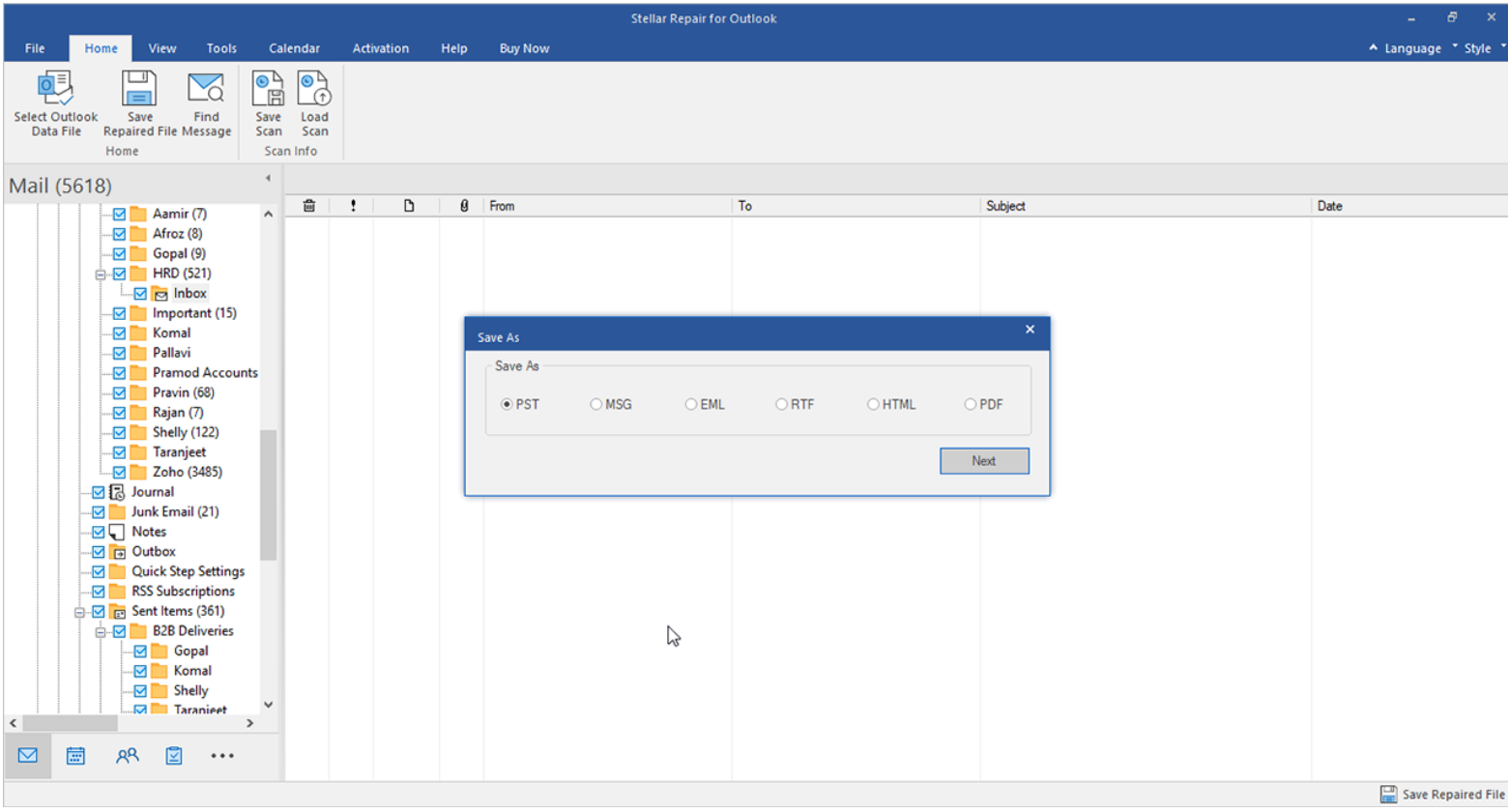 9. A Stellar Repair for Outlook többféle mentési lehetőséget kínál, például PST, MSG, EML, RTF, HTML, PDF, válassza ki a lehetőséget, amelybe menteni szeretné a PST-fájlt.