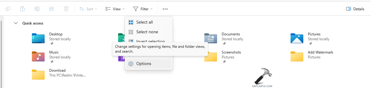 2. lépés-Ezután kattintson a Windows + E gombra és a File Explorer megnyitására. Most kattintson a három pontra, és válassza az Opciók lehetőséget.