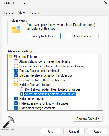 3. lépés-Ismét válassza a nézet> Rejtett fájlok és mappák lehetőséget, és válassza a rejtett fájlok, mappák és meghajtók megjelenítését. Kattintson az OK gombra, és mentse el az összes változtatást.