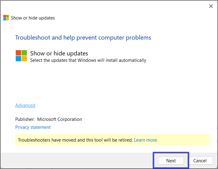 1. Töltse le és indítsa el aA frissítések hibaelhárítójának megjelenítése vagy elrejtéseA Microsoft -tól.
