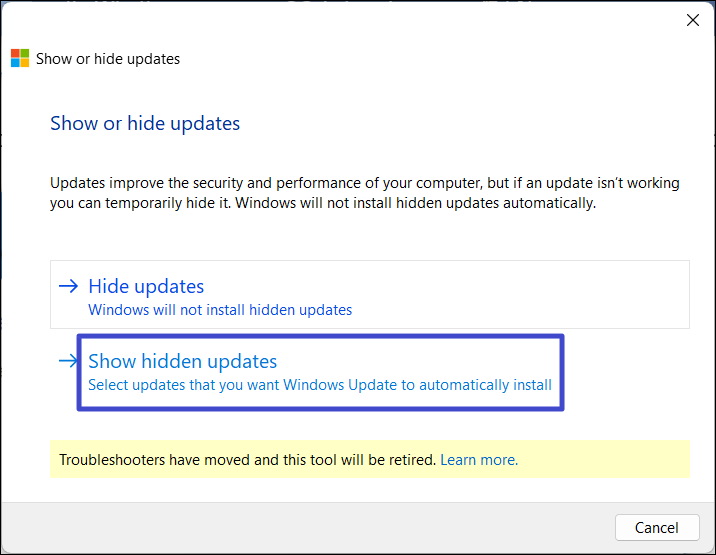 A frissítések elrejtése hibaelhárító használatával