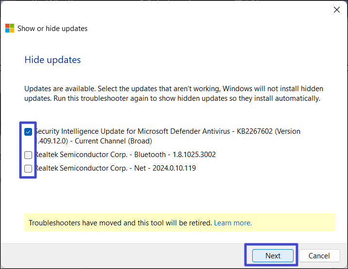 5. Ezután válassza ki az elrejteni vagy blokkolni kívánt frissítéseket, majd kattintson aKövetkező„.