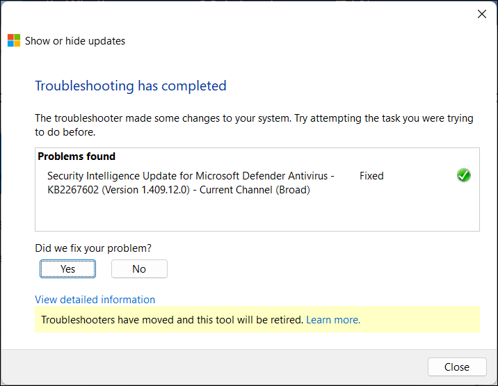 6. Kattintson a „Közeli”A befejezés. A hibaelhárító elrejti a kiválasztott frissítéseket a számítógépen.