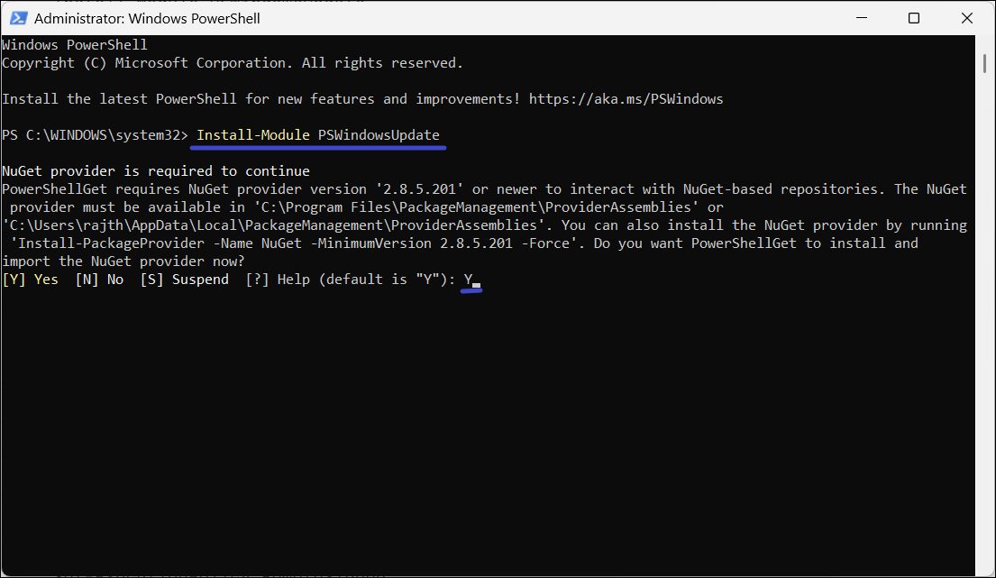 3. Ha a rendszer kéri, hogy telepítsen további csomagokat, például a NuGet szolgáltatót, írja be a „Y”Elfogadni és telepíteni.