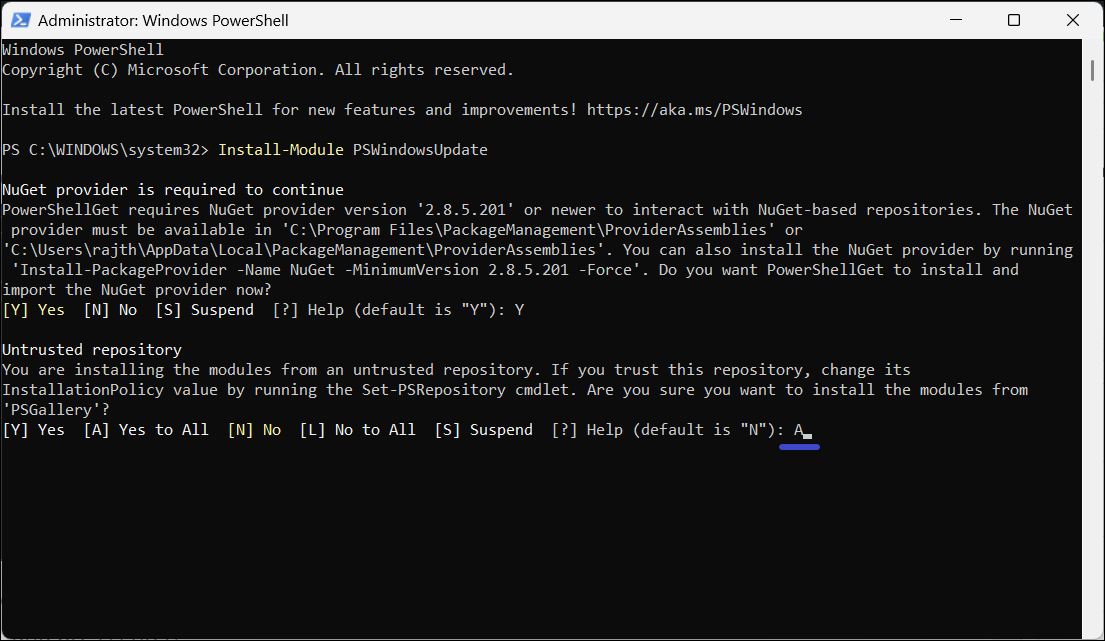 4. Amikor azt kérdezik tőle, hogy be akarja -e telepíteni a modulokat egy nem megbízható tárolóból, írja be a “Aés nyomja meg az Enter gombot.