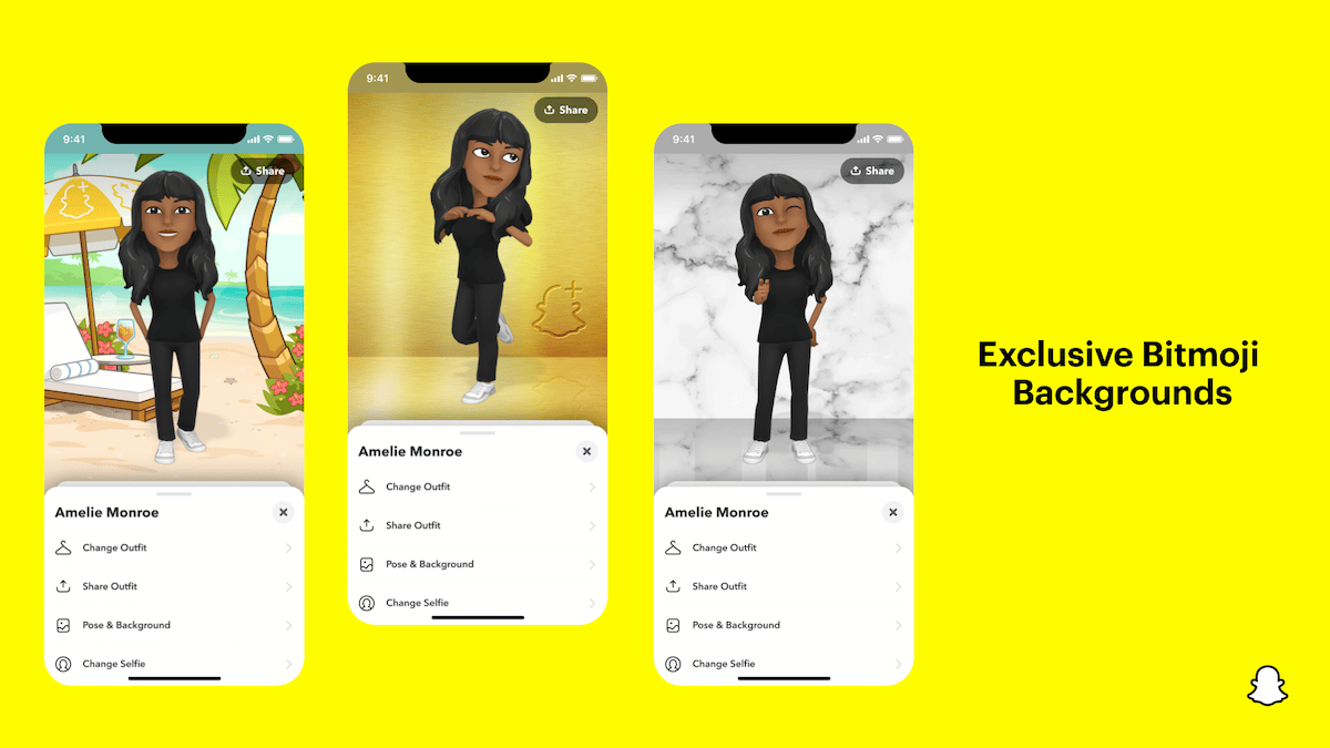 - Új Bitmoji hátterekhozzáadva, hogy a Bitmoji avatarok „nagyobb érzéket” biztosítsanak a felhasználóknak olyan különleges hátterekkel, mint a strand, a márványfal és mások.