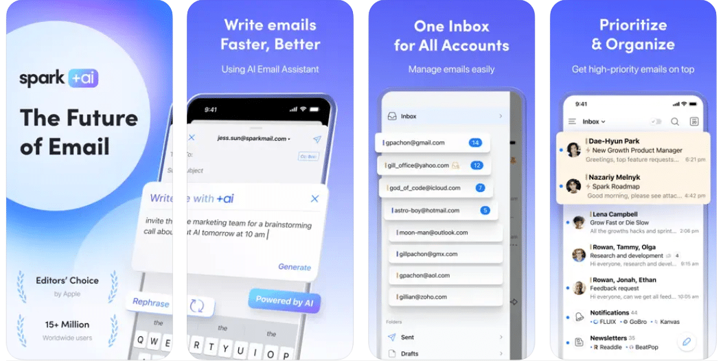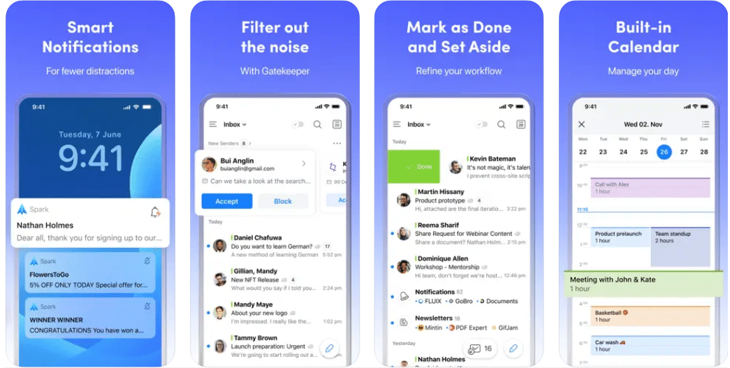 A Spark egy modern megközelítést ölel fel olyan funkciókkal, mint a szundi üzenetek, az emlékeztetők beállítása és az e -mailek ütemezése. Intelligensen rangsorolja a valódi kapcsolatok üzeneteit, miközben az alkalmazások és a hírlevelek értesítéseit kiszűri. A prioritási e -mailek funkció kiemeli a fontos küldőket és csapok kritikus üzeneteit, míg a kapuőr funkciója ismeretlen e -maileket mutat, és arra készteti Önt, hogy fogadja el vagy utasítsa el őket. Ennek értesítései beállíthatók a beállításokban.