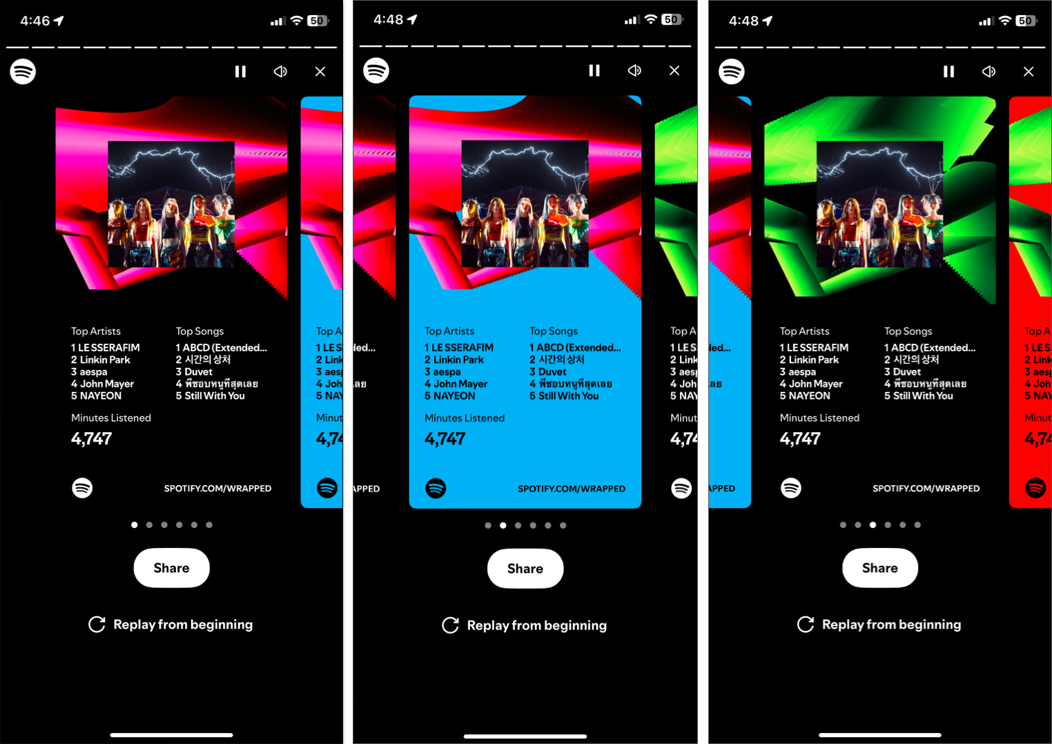 Ezenkívül a Spotify Wrapped végén teljes áttekintést kap a következő év Spotify Wrapped-éről. Ezek a gyönyörű kártyák a tiédet tartalmazzákLegjobb művészek,Top Songs, ésMeghallgatott percek. Pöccintsen jobbra/balra a kívánt színváltozat kiválasztásához, majd koppintson a ikonraRészesedésgombot alul. Ezután elküldheti a kártyát, ahogy akarja.