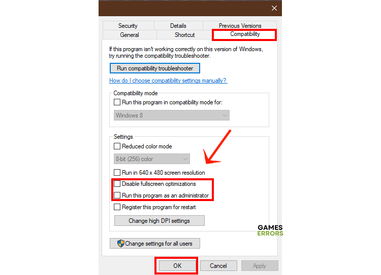 - Ellenőrizze aTeljes képernyős optimalizálás letiltásadoboz.