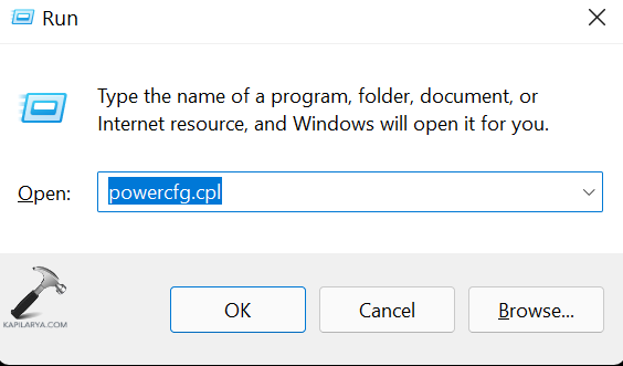 1. lépés-Eleinte nyomja meg a Windows + R gombot, és nyissa meg a Run Dialog -t. Ezután írja meg az alábbi parancsot, és nyomja meg az Enter billentyűt az Energia Opciók megnyitásához.
