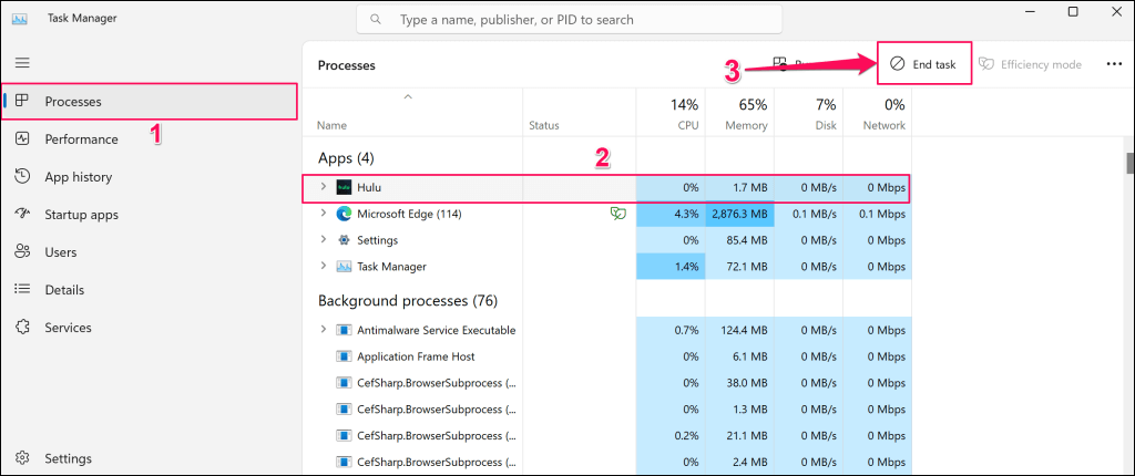 - Válassza kiFeladat befejezésea felső menüben a Hulu kényszerített leállításához.