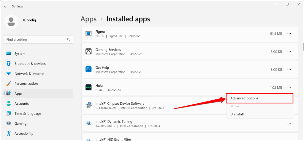 - Ezután nyissa meg a Windows Beállítások alkalmazást, és lépjen a következőreAlkalmazások elemre>Telepített alkalmazások, válassza ki ahárompontos menü ikonraa Hulu mellett, és válassza kiSpeciális beállítások.