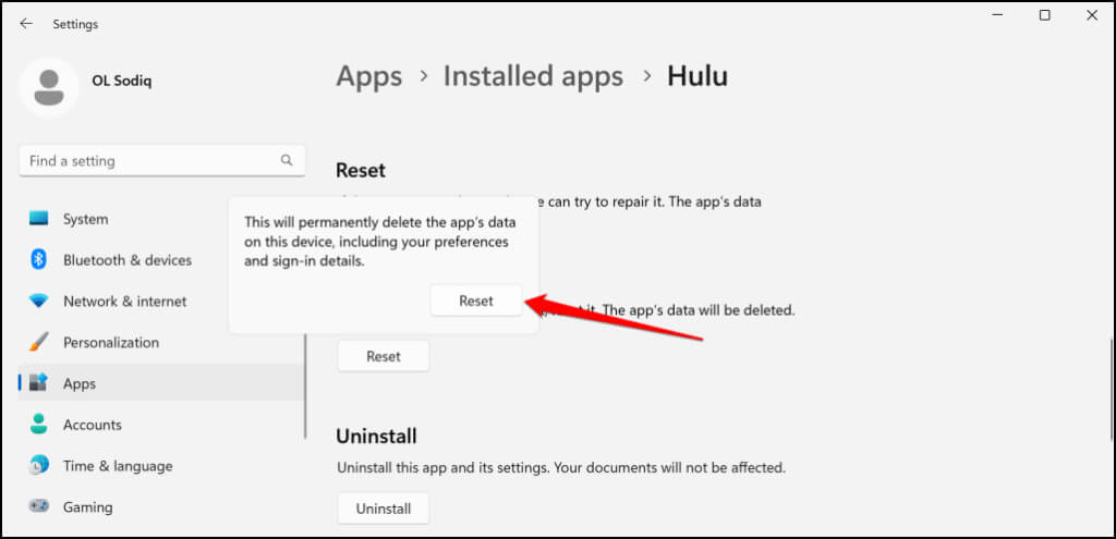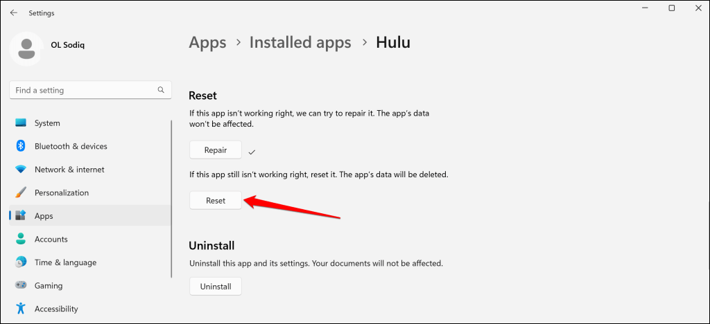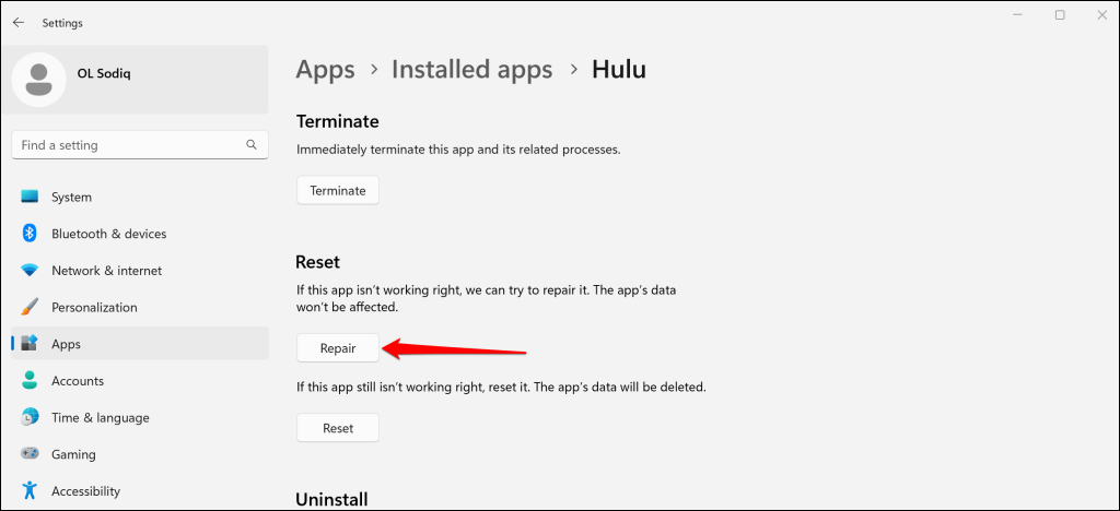 A Windows PC-k beépített javítóeszközzel rendelkeznek, amely kijavítja a nem megfelelően futó programokat. Kényszerítse ki a Hulu-t, és futtassa a javítási műveletet a Windows alkalmazás beállításai menüjében.