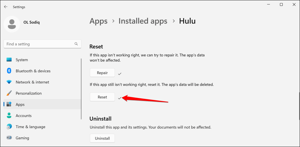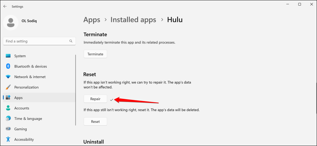 - Várja meg, amíg a Windows befejezi a javítási műveletet, és indítsa el a Hulu-t, amikor egy pipa jelenik meg a Javítás gomb mellett.