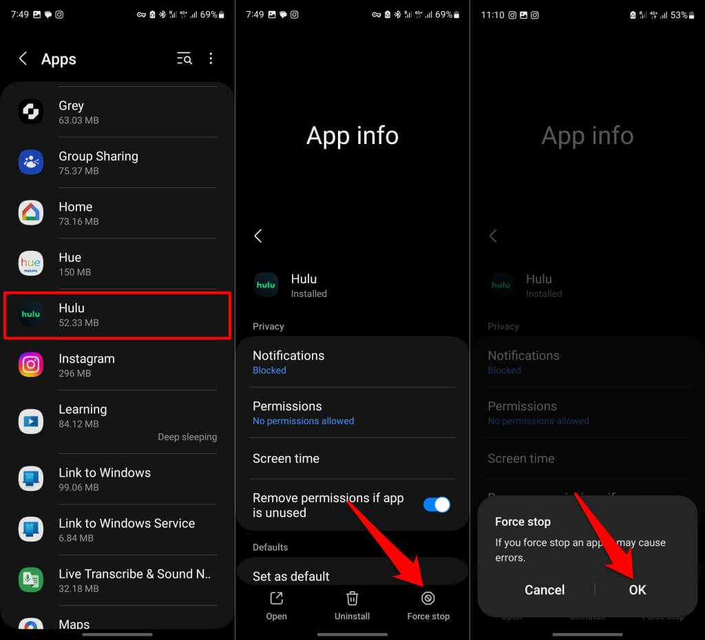 2. Force Stop és Nyissa meg újra a Hulu-t
