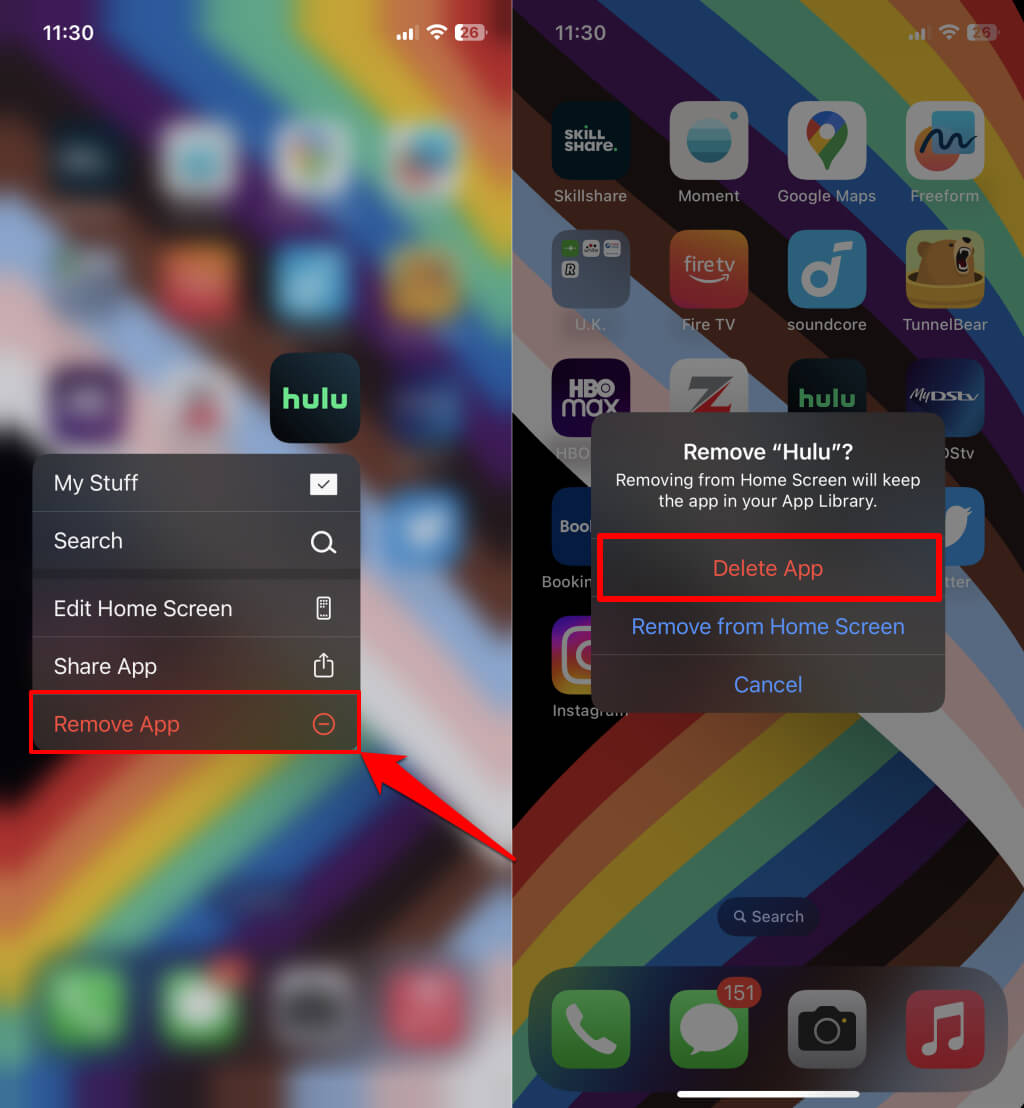 Tartsa lenyomva a Hulu alkalmazás ikonját iPhone-on vagy iPaden, majd koppintsonAlkalmazás eltávolításaés válassza ki a lehetőségetAlkalmazás törlésea felugró ablakban.
