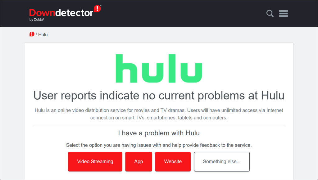 A Hulu hibásan működhet, vagy hibaüzeneteket jeleníthet meg, ha a szerverei leállást tapasztalnak. A Netflix-szel vagy a Paramount Plus-szal ellentétben a Hulu nem rendelkezik dedikált szerverállapot-figyelő eszközzel.