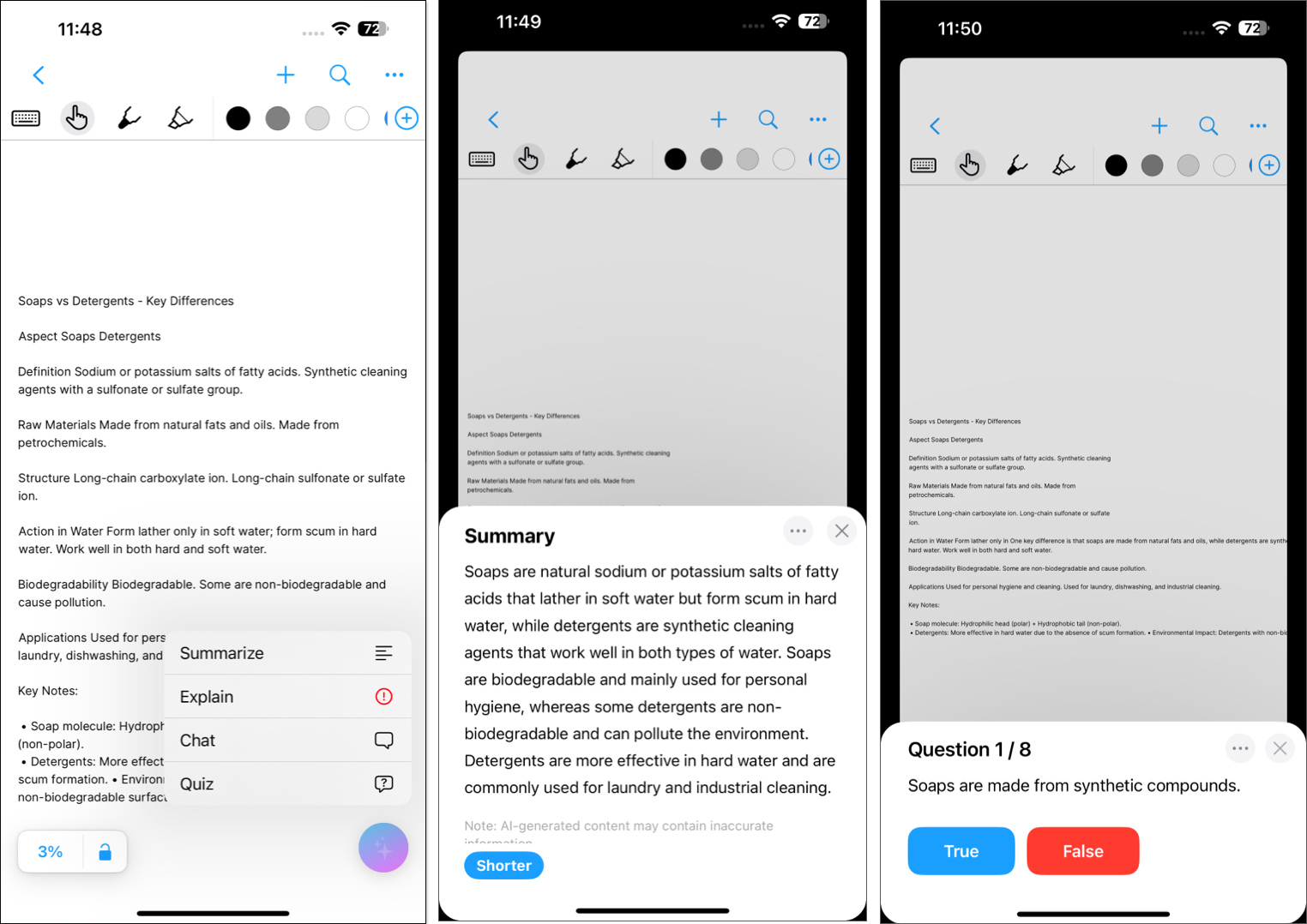 A Nebo egy intelligens és megbízható jegyzetkészítő alkalmazás, amely rendelkezik a ChatGPT képességeivel. Az elsődleges funkció, azaz a jegyzetelés mellett olyan mesterséges intelligencia funkciókat is tartalmaz, mint az Összegzés, Magyarázat, Csevegés és Kvíz. Amikor jegyzeteket ír, az alábbi gombra koppintva használhatja az AI-funkciókat. Ezek a funkciók elég jó eredményeket hoztak a használat során, és segítettek a jegyzetelési folyamatom egyszerűsítésében.