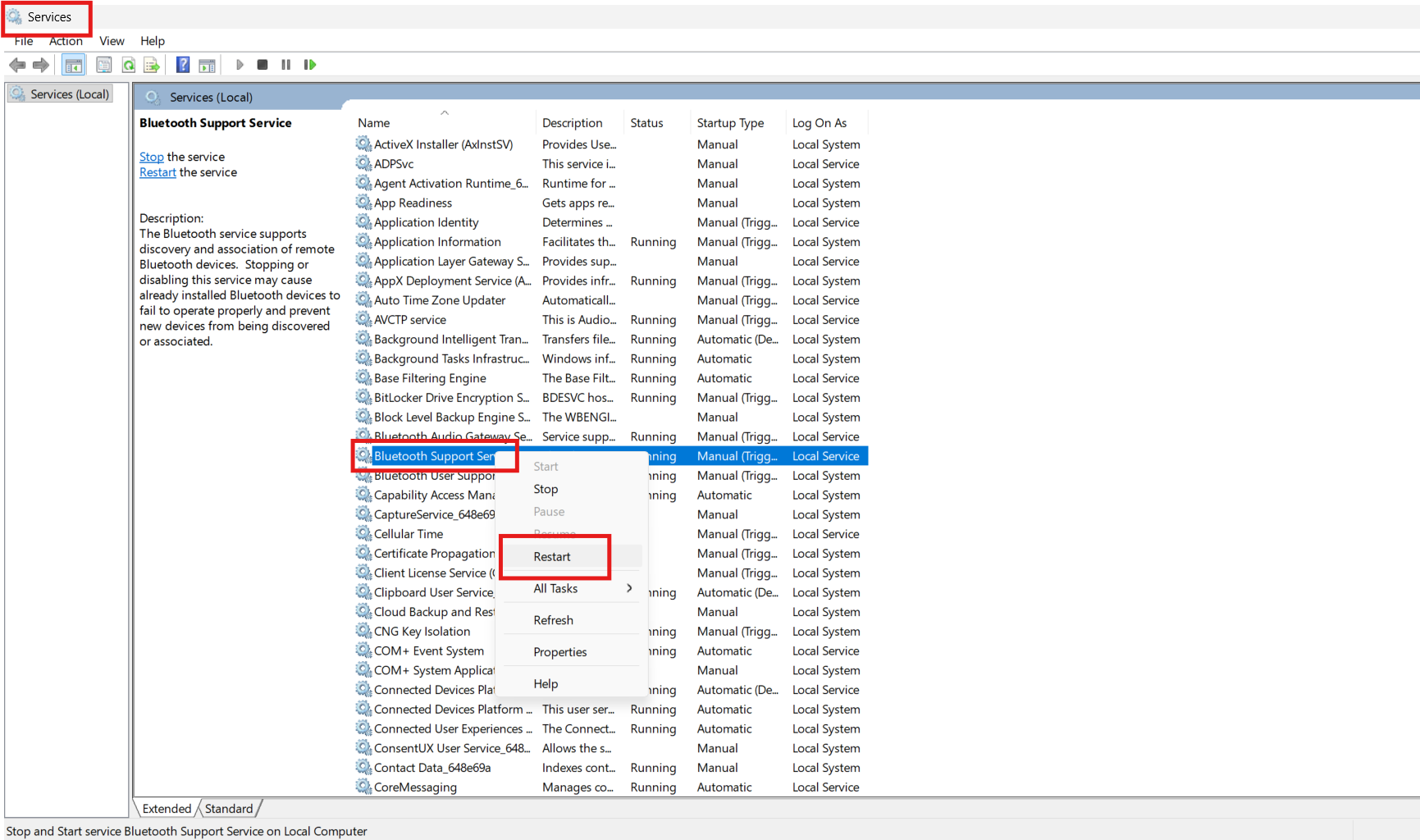 2. Keresse meg a Bluetooth támogatási szolgáltatást, kattintson a jobb gombbal, és válassza az Újraindítás lehetőséget.