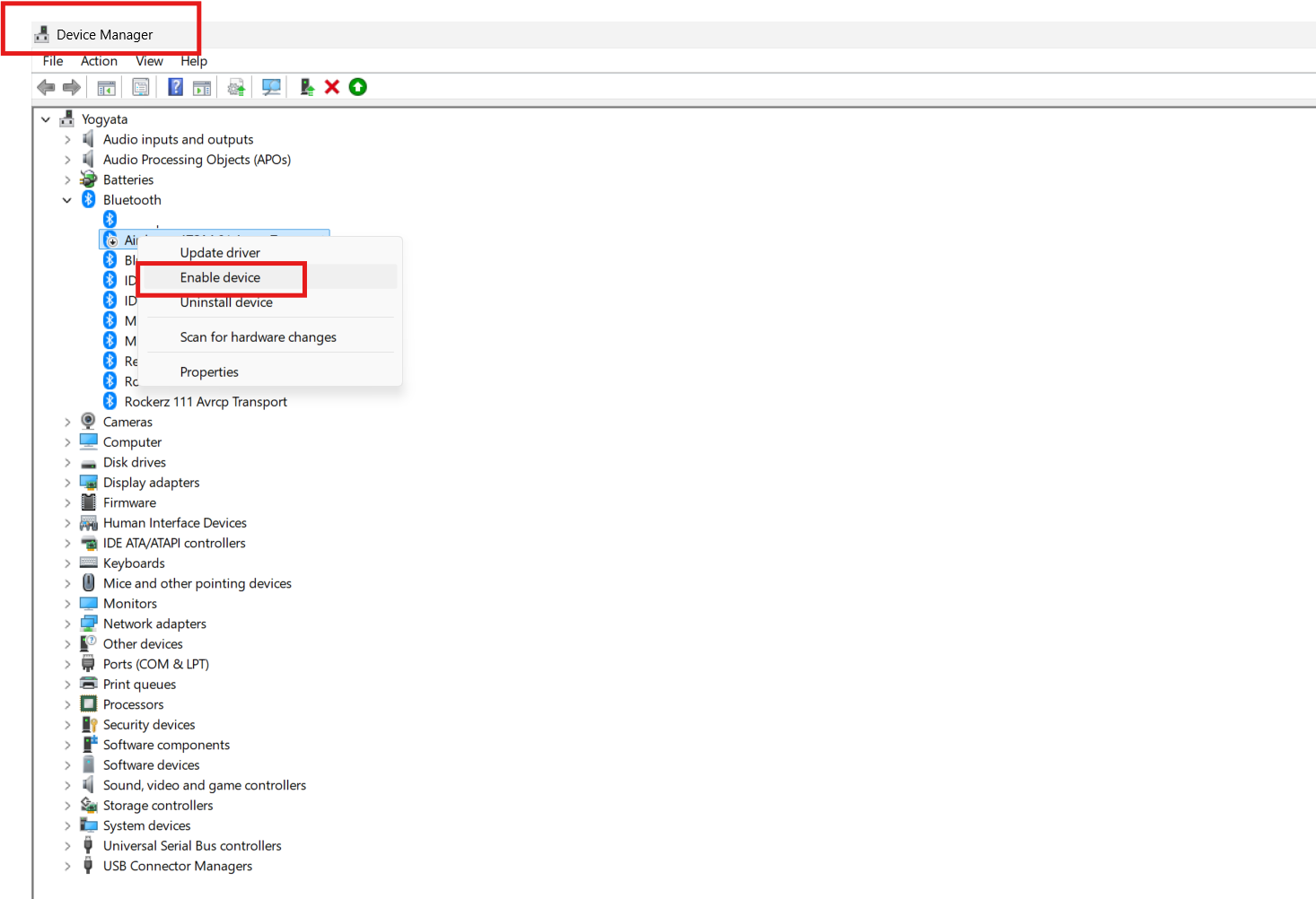 3. Kattintson jobb gombbal a Bluetooth-adapterre, és válassza az Eszköz engedélyezése (vagy egyes eszközökön az Illesztőprogram frissítése) lehetőséget.