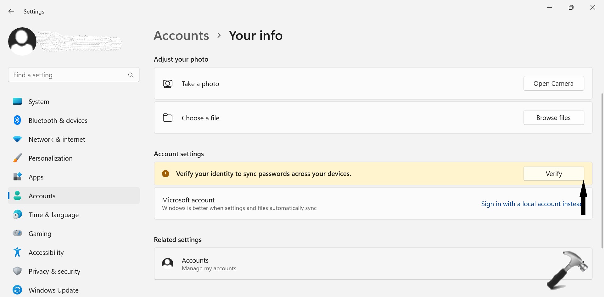 3. Ellenőrizze, hogy szerepel-e az Ön neve alatt egy e-mail. Ellenkező esetben kattintson a gombraJelentkezzen be helyi fiókkalhelyette a Fiókbeállítások alatt.