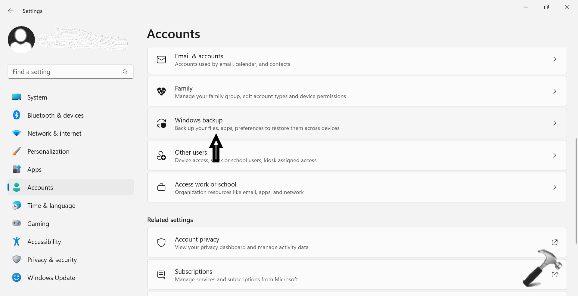 2. Kattintson a Fiókok elemre a bal oldali ablaktáblában. MajdWindows biztonsági mentésa jobb oldalról.