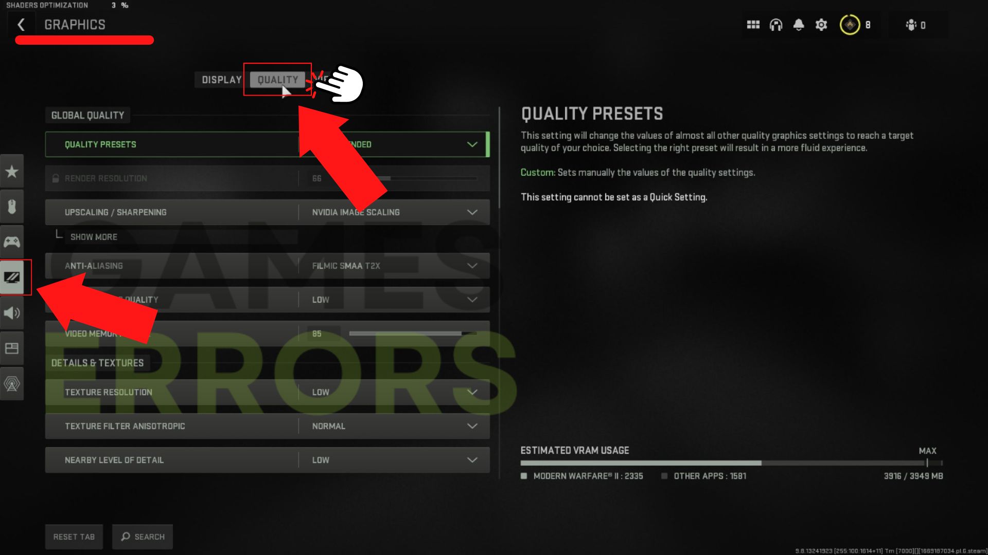 - Shader Minőség: Magas (ha azt akarja, hogy a Gun Camos felbukkanjon)