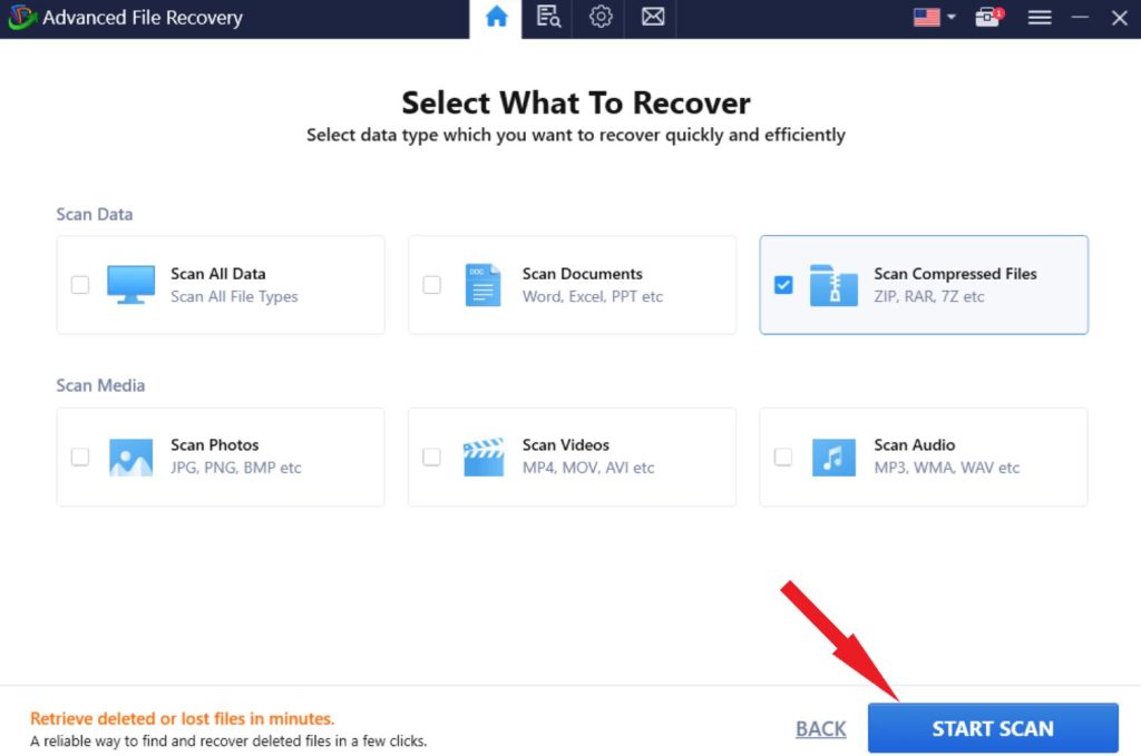 4. lépés:Most jelölje be a négyzetetTömörített fájlok beolvasásaés kattintson aINDÍTÁS ELLENŐRZÉSgomb.