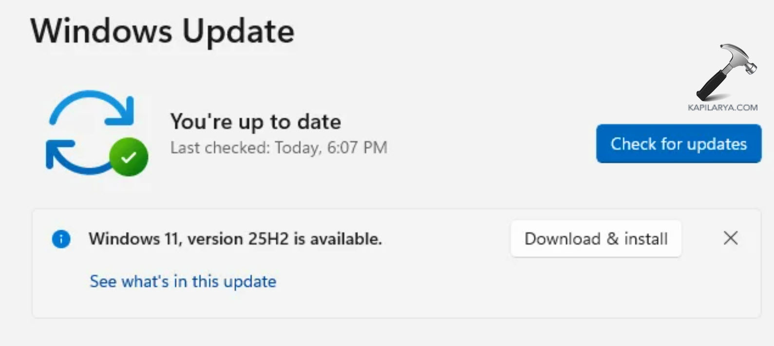Amikor a Windows Update oldalra lép, rendelkeznie kell a Windows 11 25H2-es verziójával. Kattintson a Letöltés és telepítés gombra, és a frissítés telepítésre kerül. Ha a szalaghirdetés még mindig hiányzik, győződjön meg arról, hogy be van kapcsolva a Legfrissebb frissítések letöltése, amint elérhetővé válik opció.