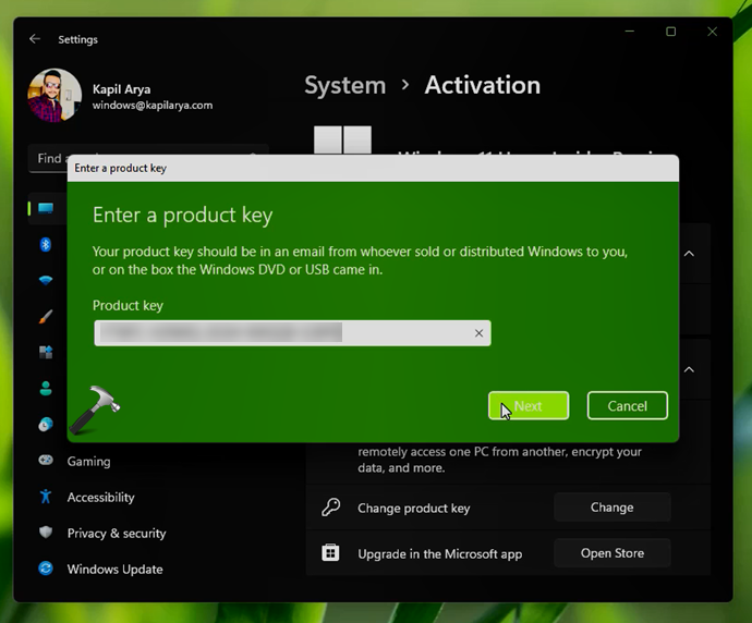 5. Amikor a rendszer kéri, kattintson a Tovább/Windows aktiválása gombra. Ezután kattintson a Start gombra.