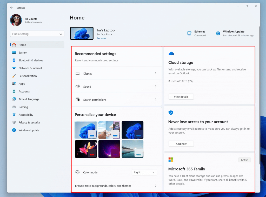 A Microsoft új otthoni beállítást is hozzáadott a Windows 11 -hez. A otthoni beállítás „dinamikus és személyre szabott élményt” nyújt a felhasználók számára. Interaktív kártyákat tartalmaz, amelyek különféle típusú eszközöket és a kapcsolódó beállításait képviselik. Például a felhőalapú tároló kártya tudatja Önnel, ha a felhőben elfogy a szoba.