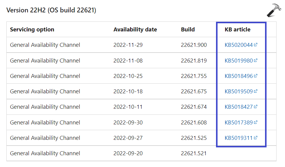 1. A frissítés kódszámát a Microsoft Frissítési előzmények webhelyén találja.